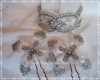 Conjunto de novia en nácar, cristales Swarovski (color a elegir) y detalles plateados para darle más elegancia.